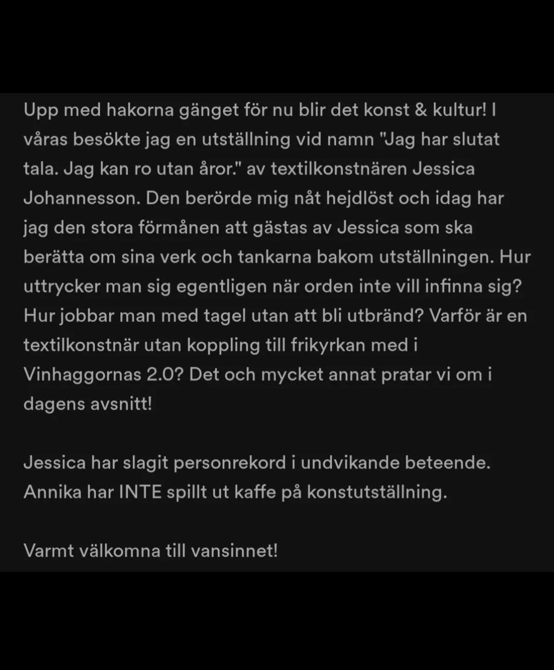 Jag gästade podcasten Vinhaggorna 2.0 och detta resulterade i ett fint samtal med Annika Eklöf om min utställning ”Jag har slutat tala. Jag kan ro utan åror”, den konstnärliga processen, trauma, tråd och framtida konstnärliga projekt.