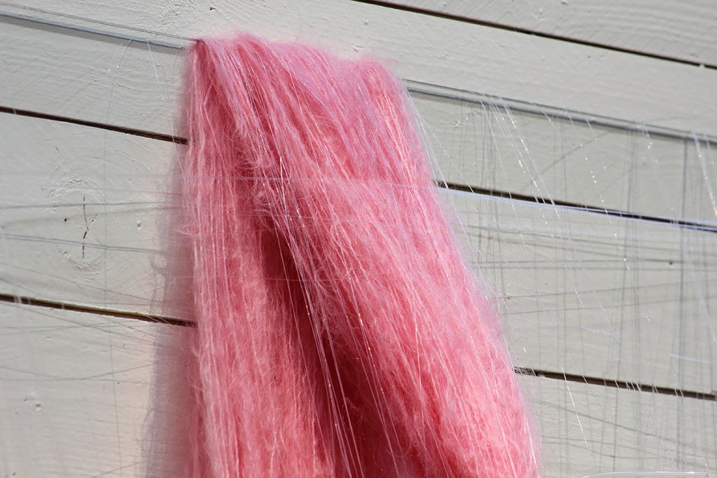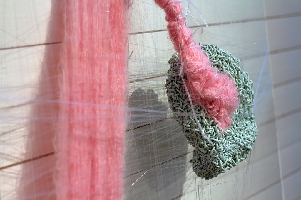 Almost a kiss Titel: Almost a kiss. (I) Material: Plastsnöre, mohairgarn, syntettråd och glas. Mått: Ca 100 x 125 x 20 cm. År: 2016.