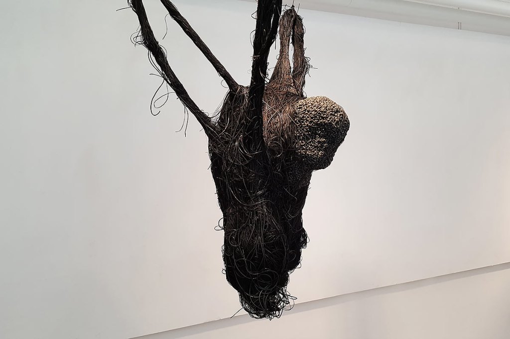 Material: Pappersraffia, bomullstråd, gummislang och rayontråd.