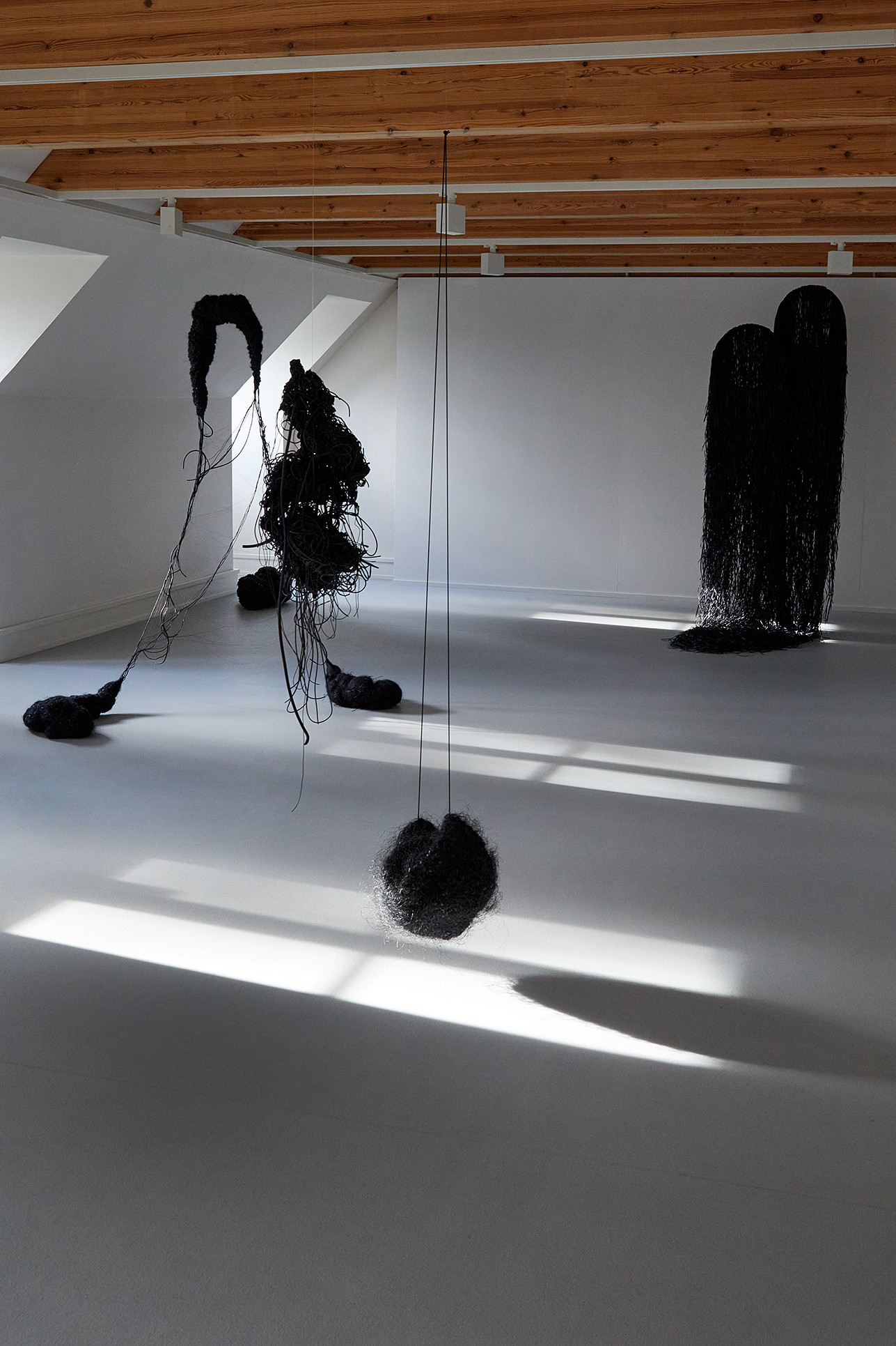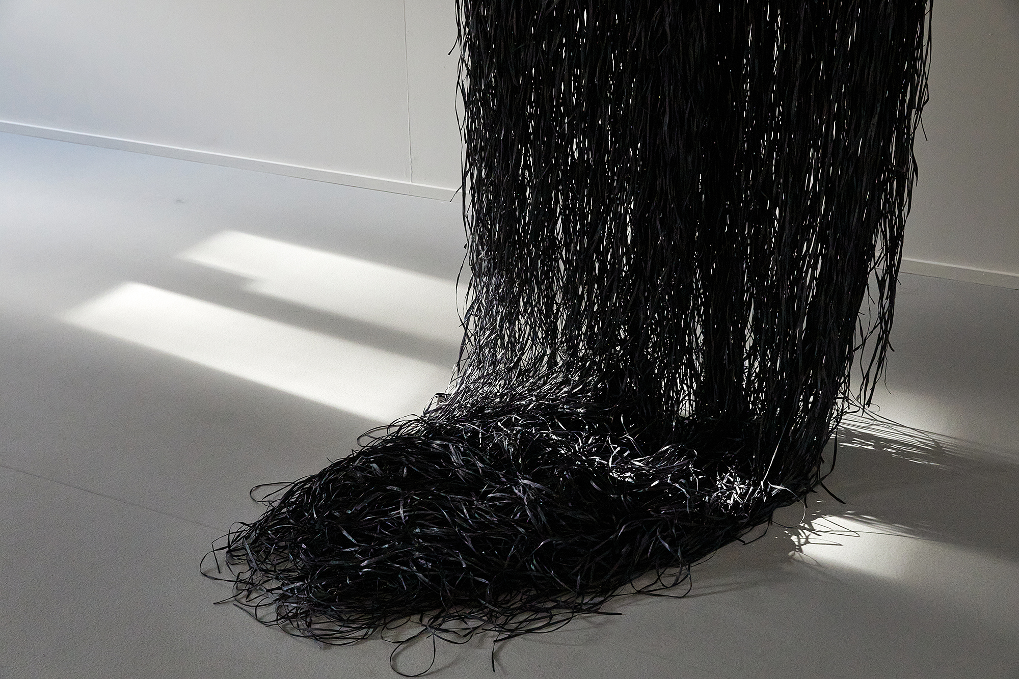 Hon och alla hennes jag Titel: Hon och alla hennes jag. (III)Material: Metall och manilahamparaffia.Mått: Ca 220 x 130 x 30 cm. År: 2024.