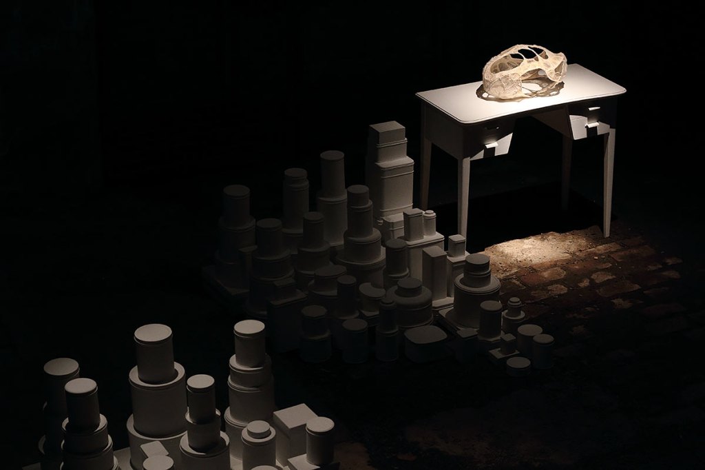 ”Hon skriker inte så mycket längre, men ibland längtar hon så innerligt” är en gestaltning av en människas känslovärld. Där skulpturen kan vara en lämning, en kvarleva, ett inre organ, en rest eller något som ska vidare någon annanstans. Min berättelse är inte sammanhängande, den består av punkter, som alla är i rörelse, där det inte finns någon sanning, samtidigt som allt är sant. Skrivbordet som står stadigt. Hon som är närvarande. Sorterat och uppradat, lådor, askar och burkar. Hon som är så skör och samtidigt den starkaste person jag mött.”