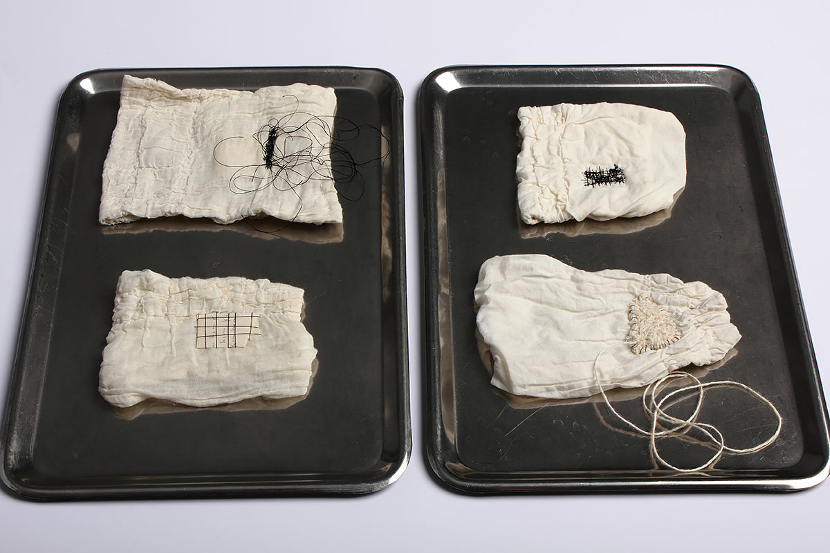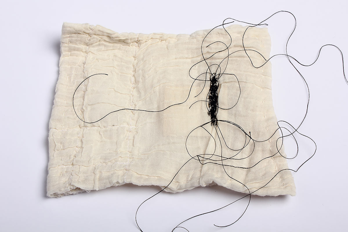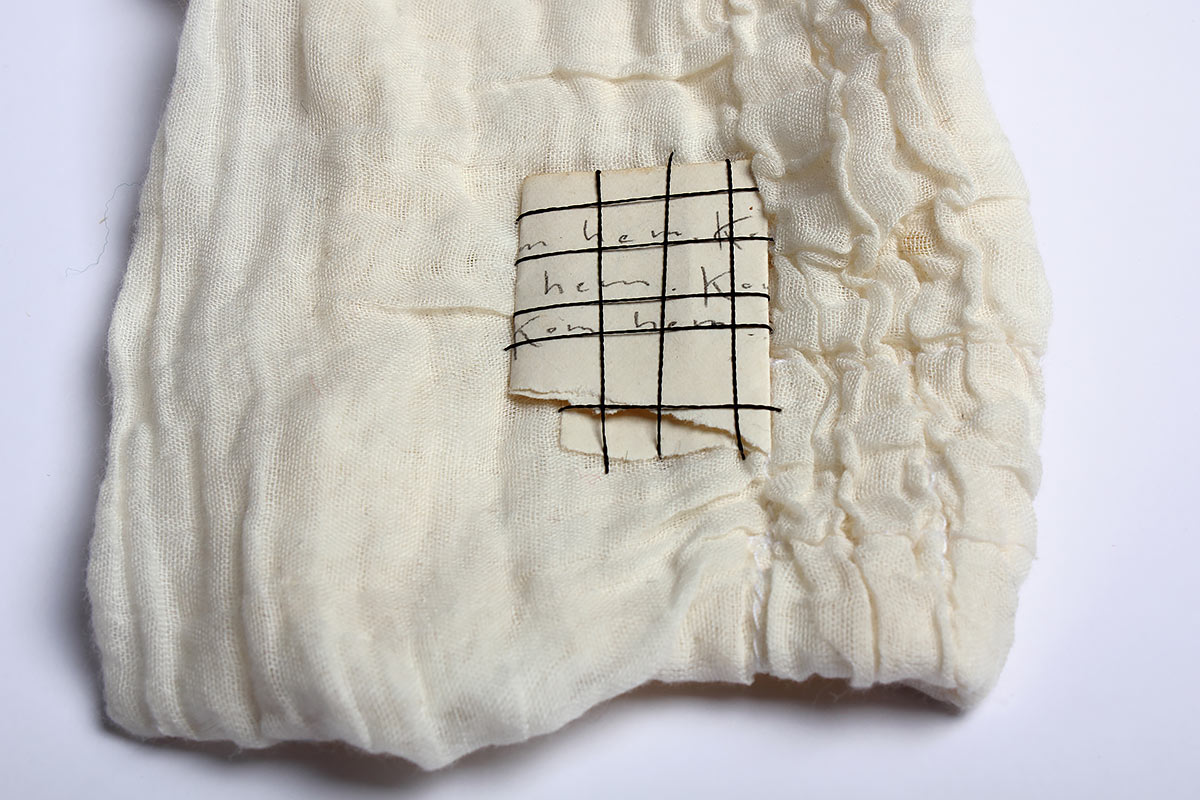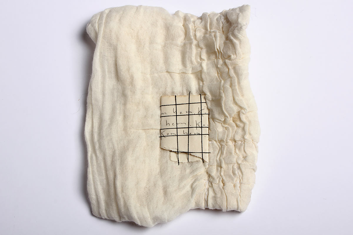 Idag är jag ömtålig Titel: Idag är jag ömtålig. Material: Textilier, tråd, papper och stålbrickor. Mått: Ca 40 x 50 cm. År: 2011.