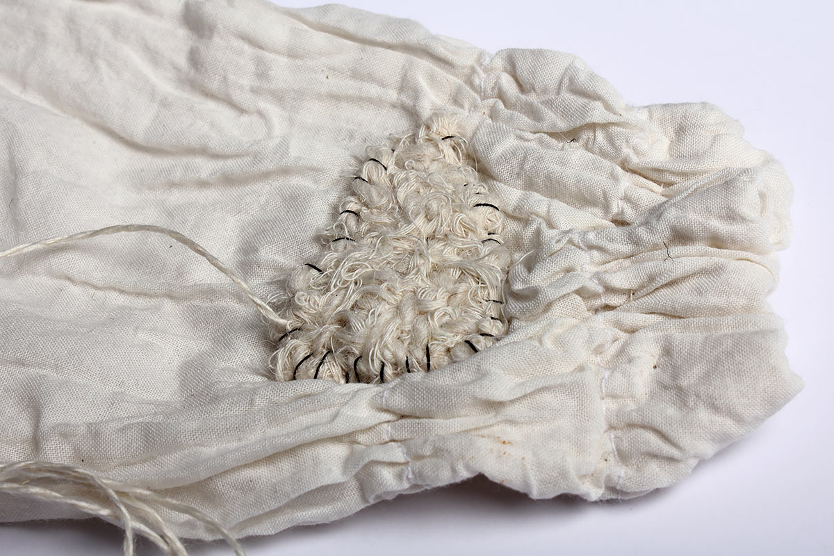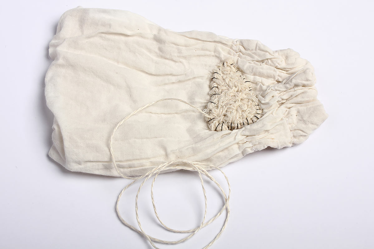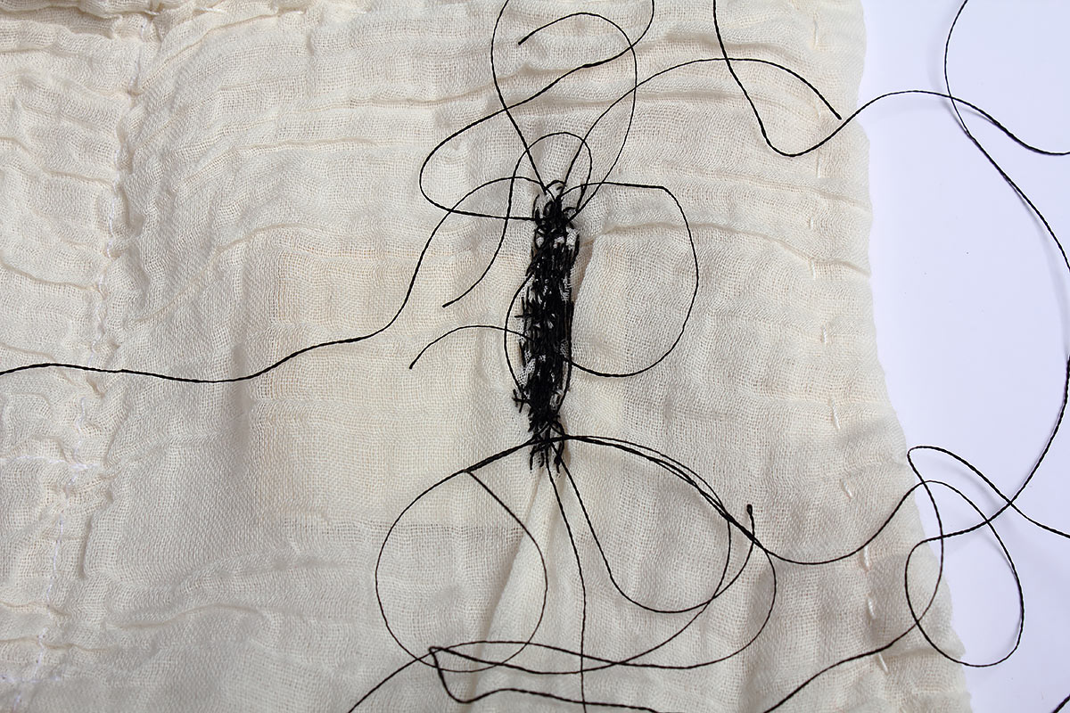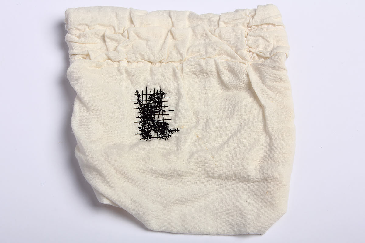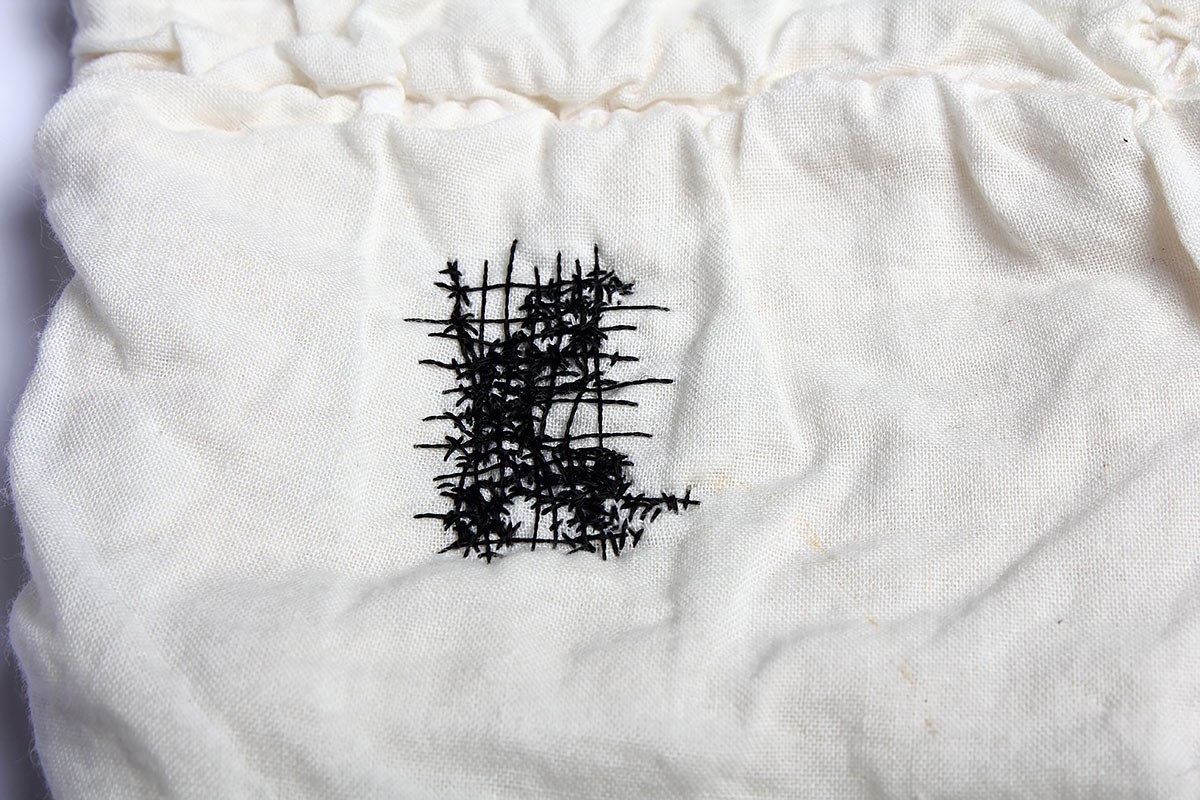 Idag är jag ömtålig Titel: Idag är jag ömtålig. Material: Textilier, tråd, papper och stålbrickor. Mått: Ca 40 x 50 cm. År: 2011.