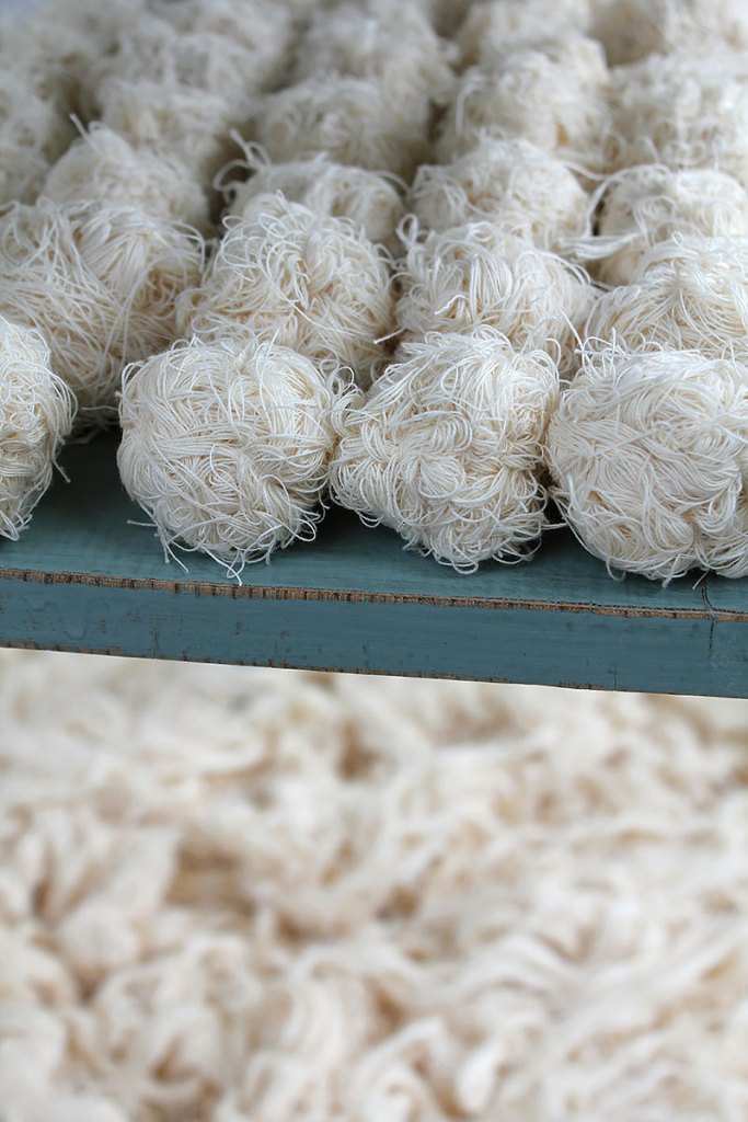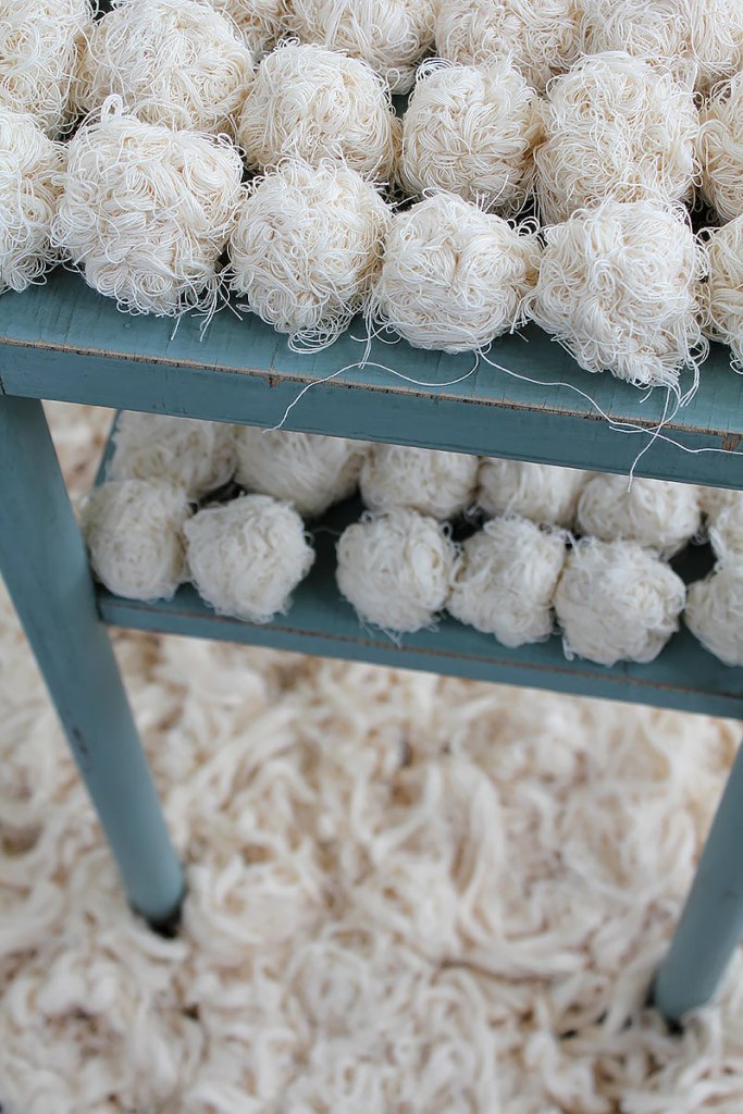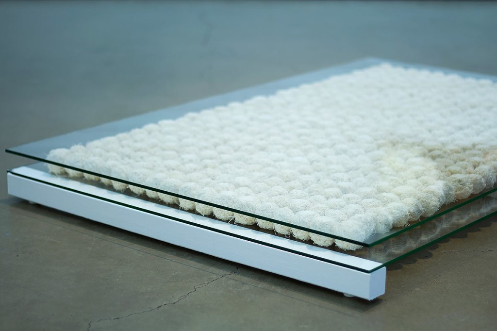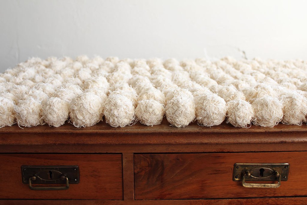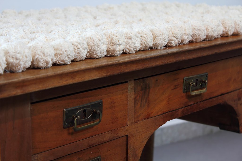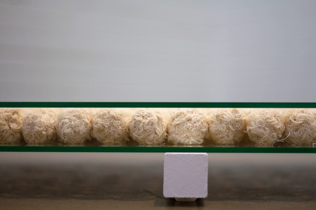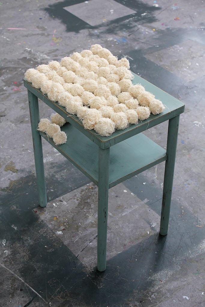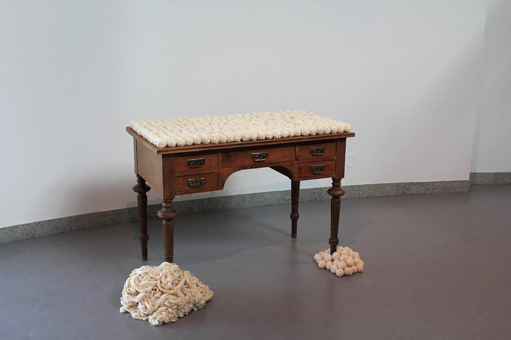 Material: Bomullstråd, skrivbord, bord, trä och glas.