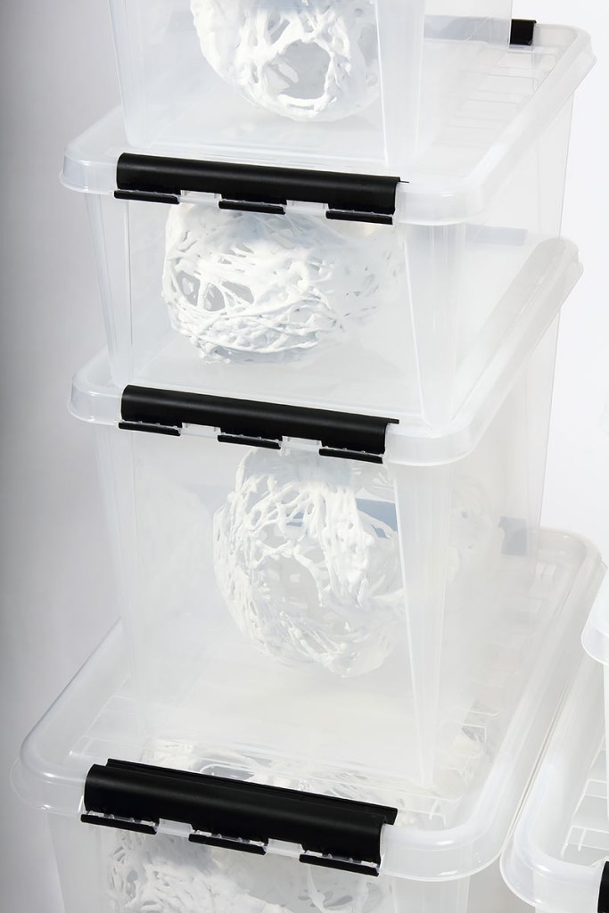 De vita skulpturerna är sköra, tappar du dem i golvet går de sönder, de krackelerar i tusen bitar. Var och en av skulpturerna har placerats i en plastlåda, en för många välkänd låda som man ofta förvarar sina saker i. Men dessa lådor är inget man förvarar synligt i sitt hem, utan de förvaras ofta i garderober, på vinden eller i garaget, där det finns en dörr att stänga. Locket har fästen som man låser fast så inget kan komma ut, lådorna går praktiskt att stapla på varandra.