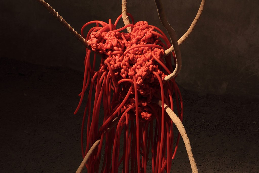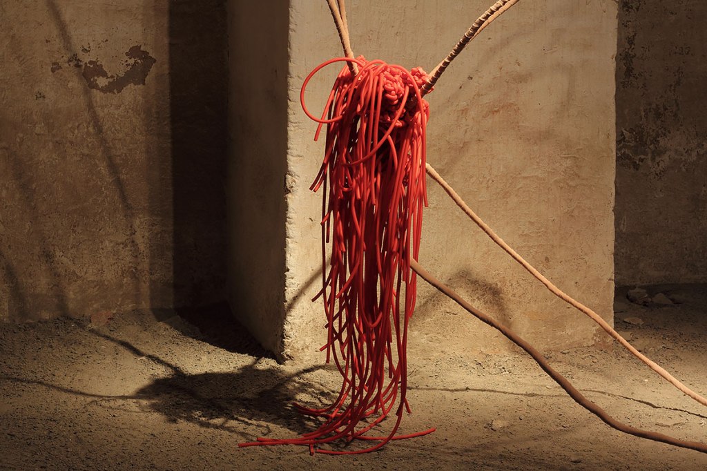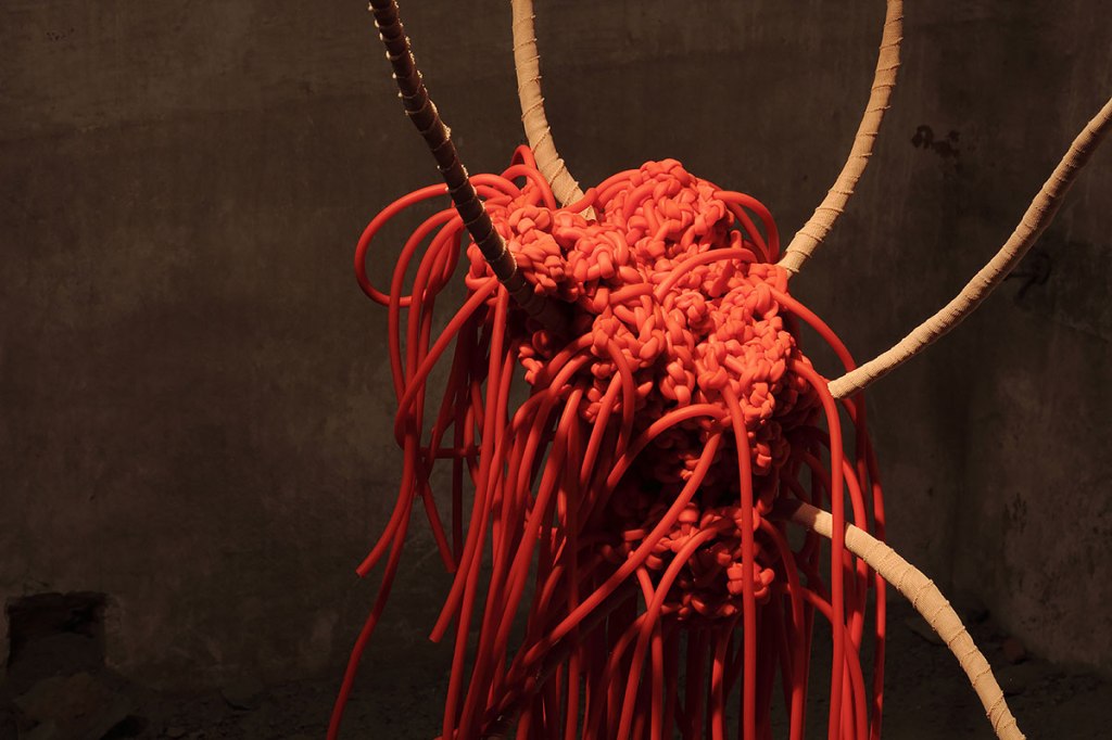 No more beauty Titel: No more beauty. (IIII) Material: Metall, tyg och latexslang. Mått: Varierande mått. År: 2017.