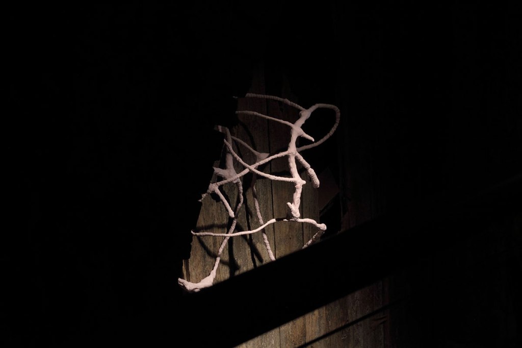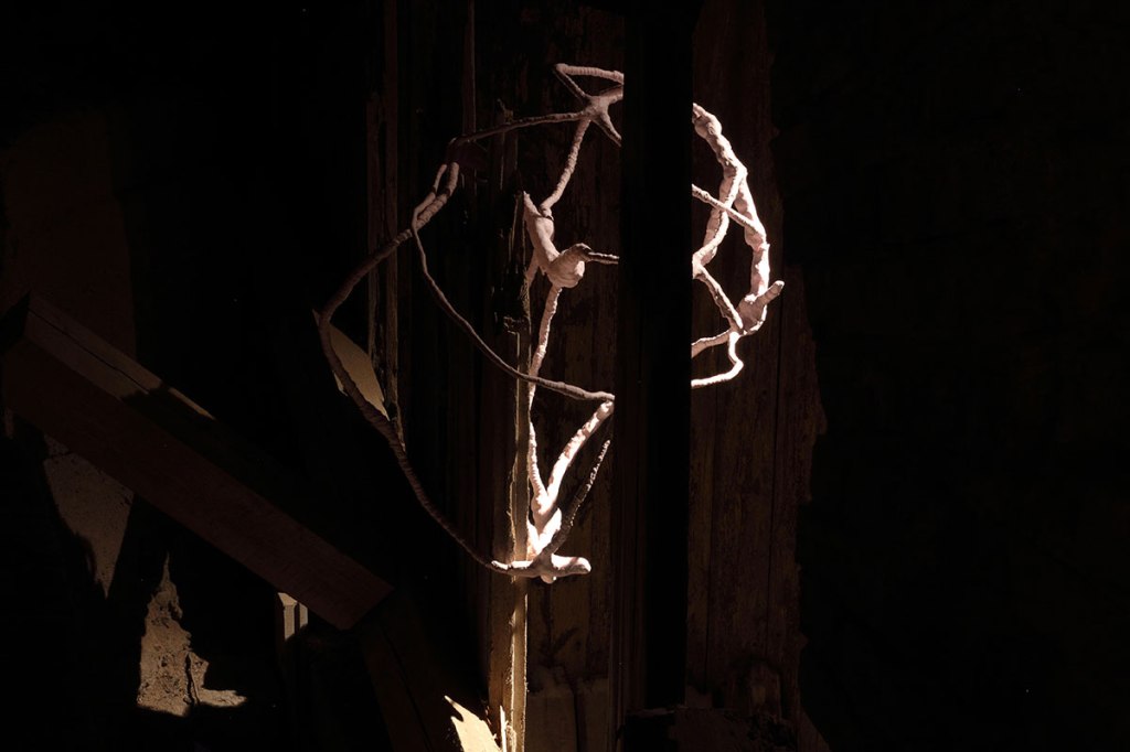 Behörighet Titel: Behörighet. (IIIII IIIII) Material: Ståltråd, textil, lera och färg. Mått: Ca 70 x 40 x 50 cm. År: 2017.