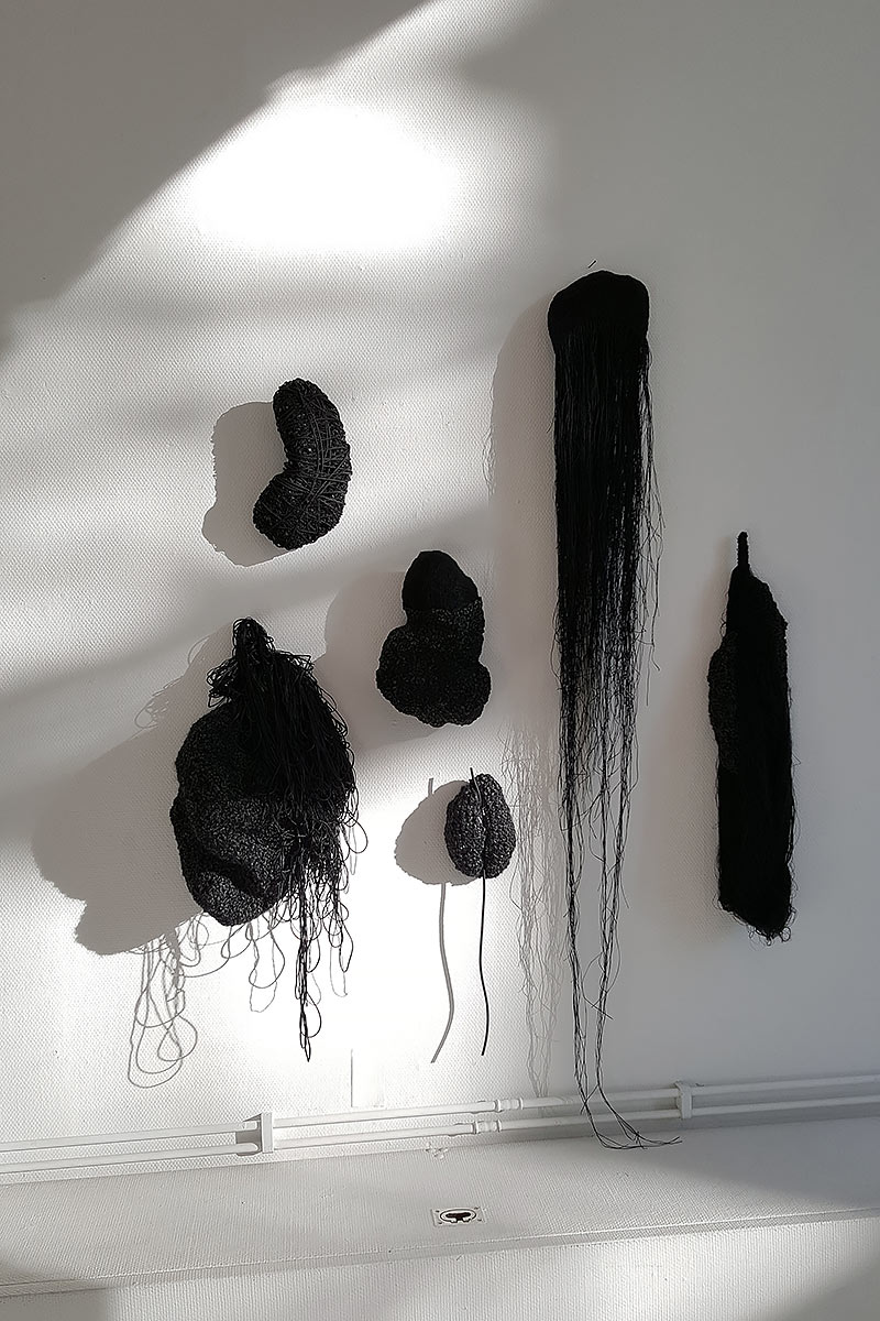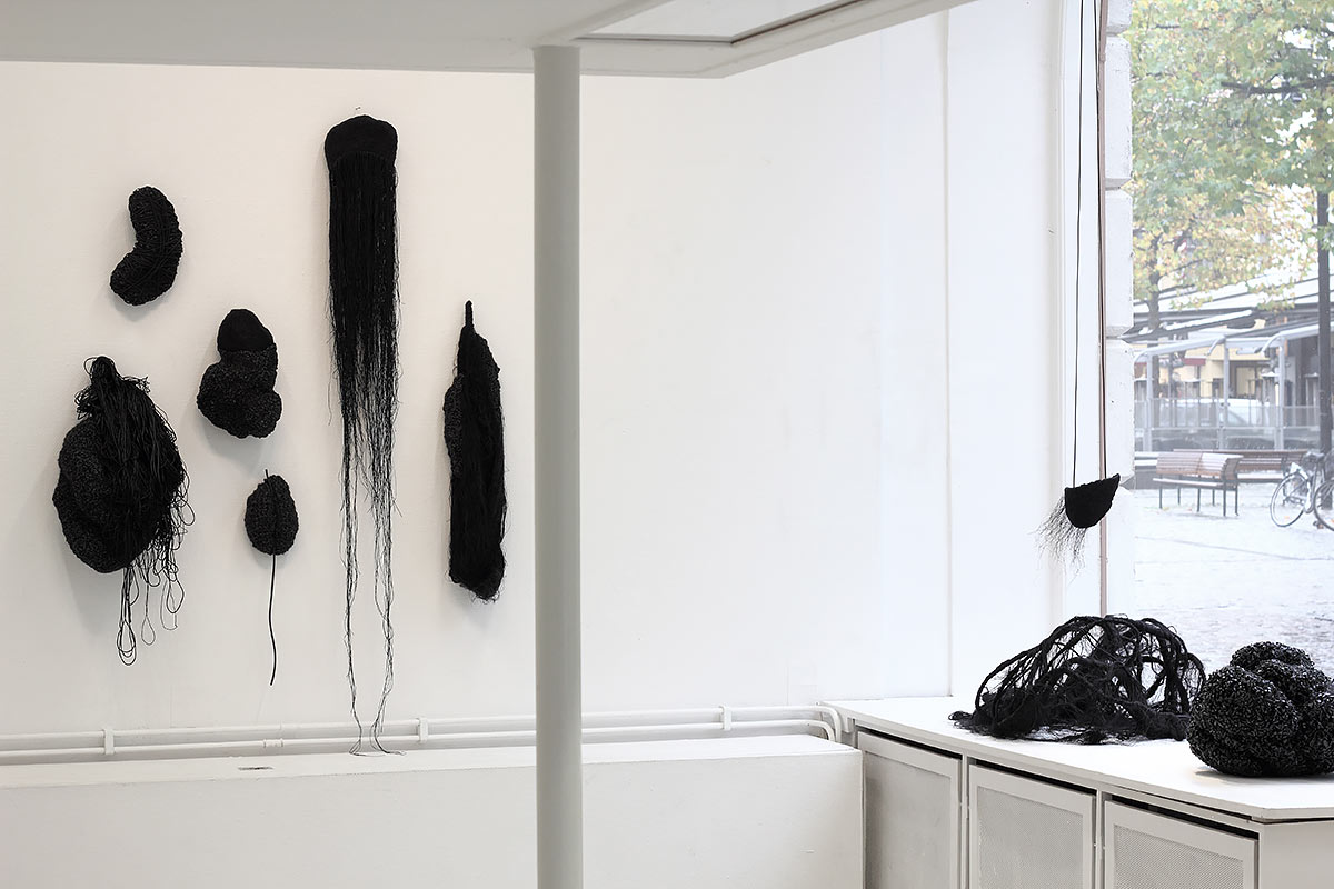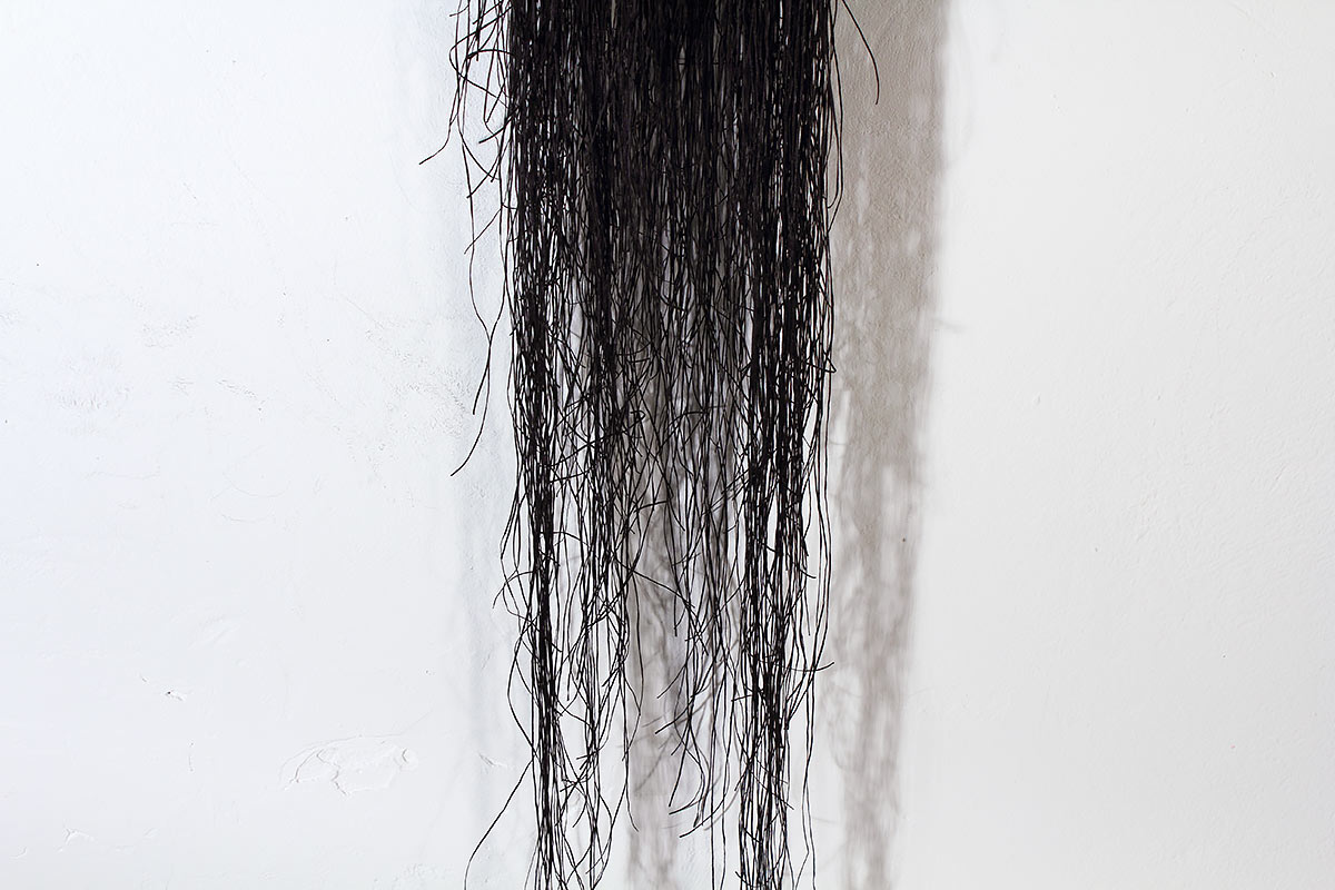 Så tyst därborta Titel: Så tyst därborta. Material: Bomullsgarn, ståltråd, ull och silke. Mått: Ca 160 x 20 x 15 cm. År: 2014.