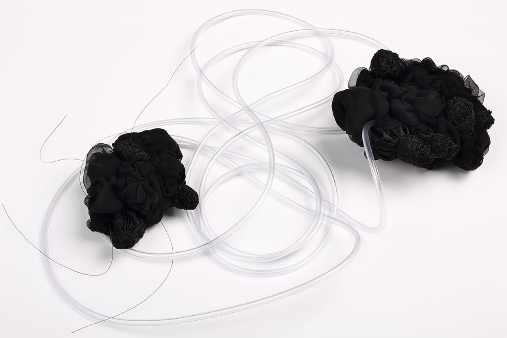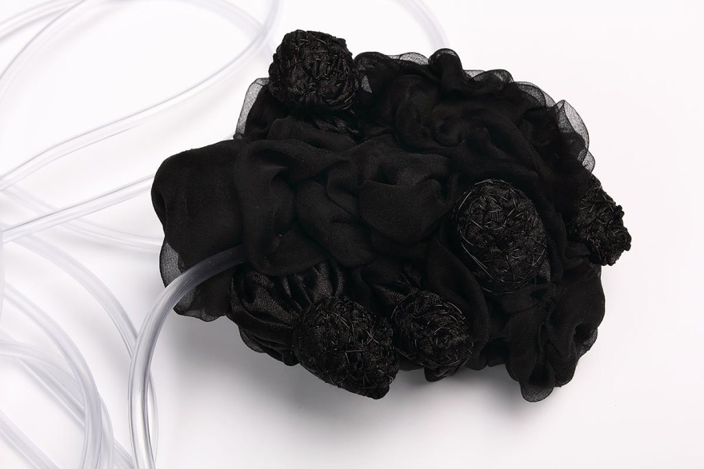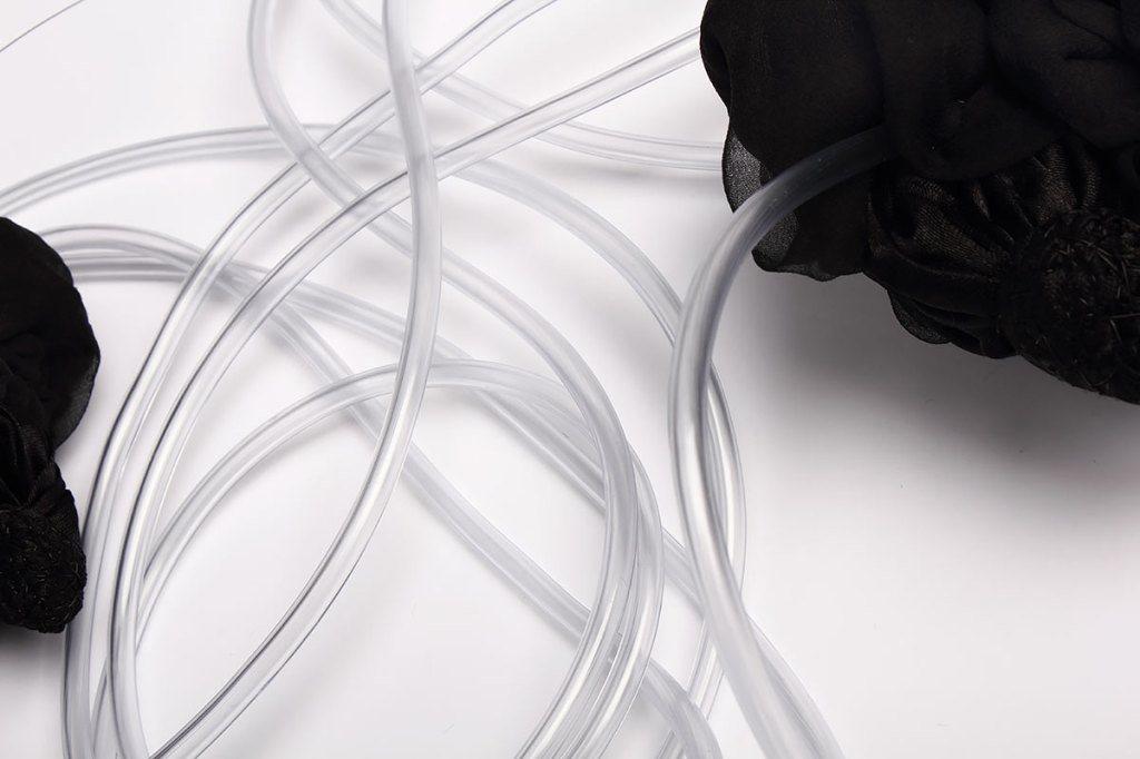 Material: Syntettextil. syntettråd, nylontråd, sidentyg och plastslang.
