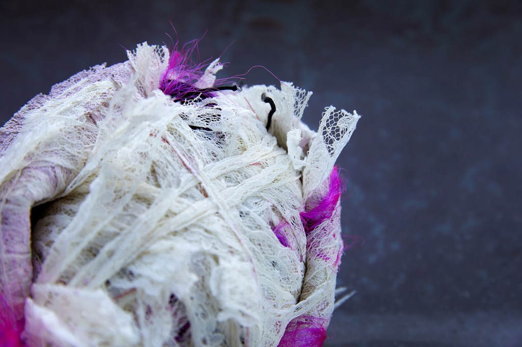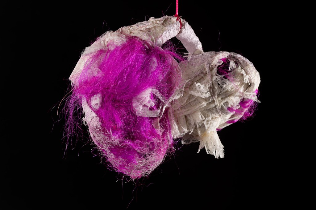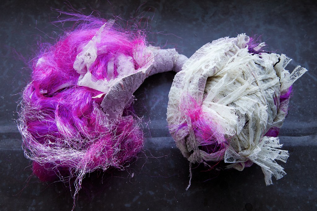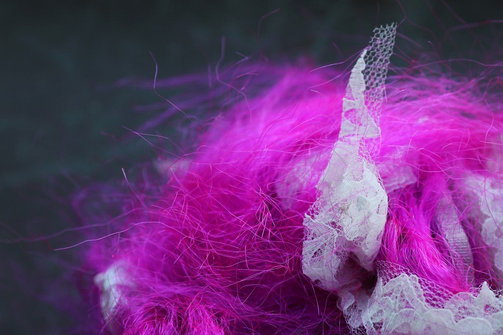 Material: Spets, färg, syntethår, textilband och syntettråd.