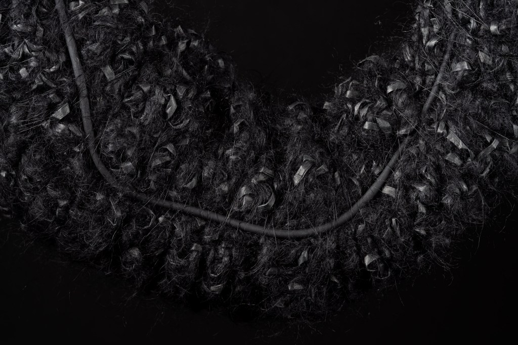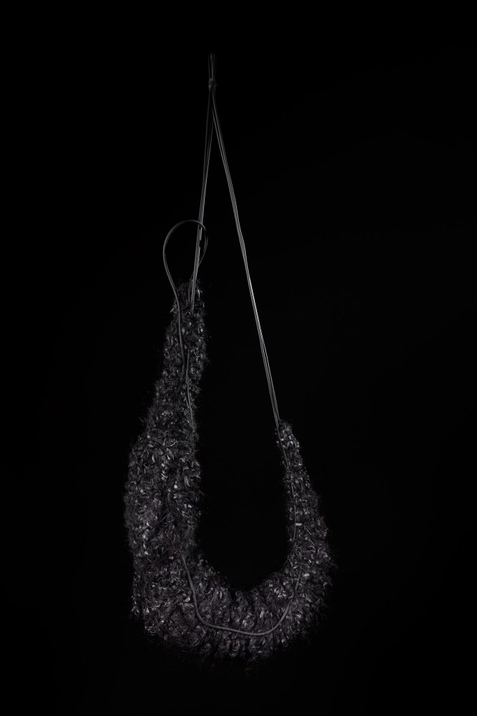 Material: Pappersraffia, mohairgarn, syntettråd och gummislang.